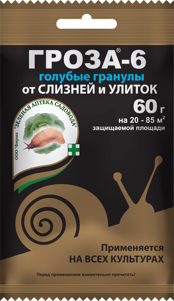 Гроза - готовые к применению гранулы для борьбы с улитками и слизнями. Кроме активного вещества против слизней (метальдегида) препарат содержит добавки привлекающие вредителей и отпугивающие птиц. Слизни и улитки с большой охотой идут на гранулы Грозы, а после контакта с ними теряют слизь и гибнут. Обычно 1-2 обработок на сезон достаточно, что бы защитить растения от слизней.